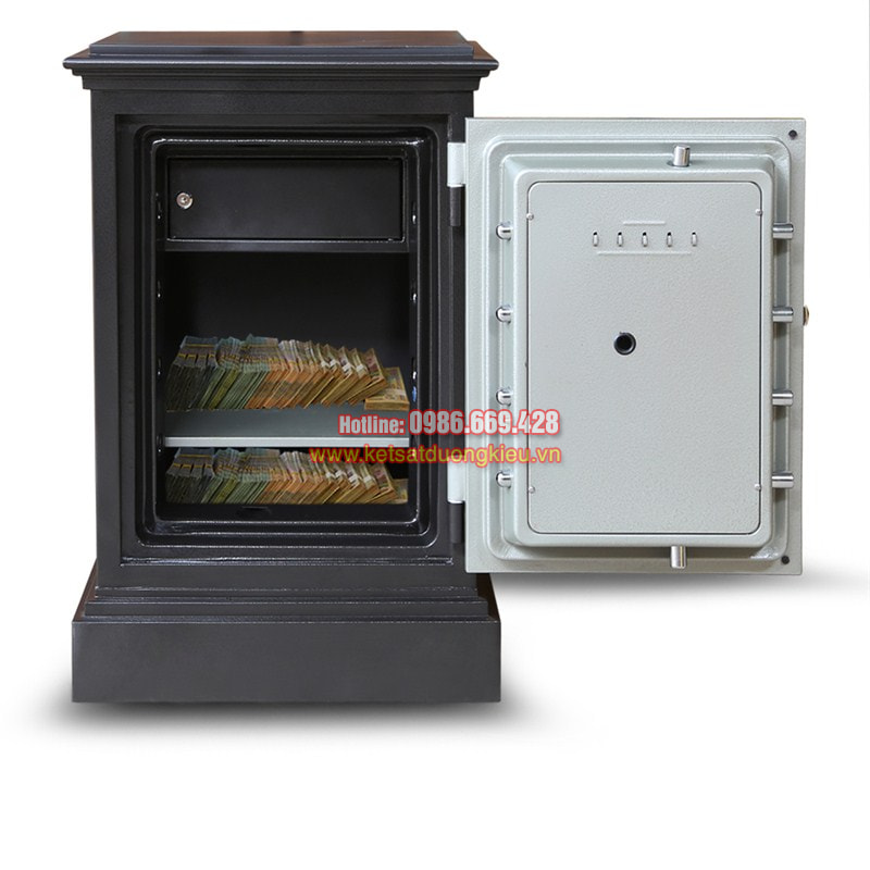 - 2 bản lề ngoài, hệ thống chốt an toàn trên cánh cửa tự động bật - ăn sâu vào thân két khi đóng cửa. Hèm cửa thiết kế bậc tam cấp chống cháy tương đương két nhập khẩu.