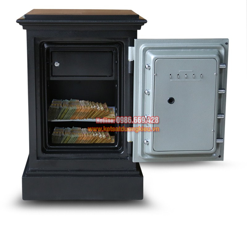 - 2 bản lề ngoài, hệ thống chốt an toàn trên cánh cửa tự động bật - ăn sâu vào thân két khi đóng cửa. Hèm cửa thiết kế bậc tam cấp chống cháy tương đương két nhập khẩu.