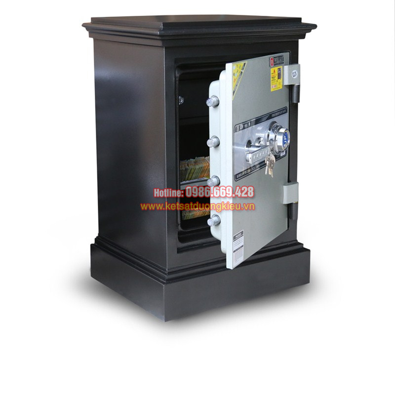 - Tính năng : chống cháy 1200°C trong vòng 120p, khóa cơ đổi mã theo ý muốn, chống dò mã, thân và cánh được đúc đặc hoàn toàn, 01 khóa chìa bi chống sao chép