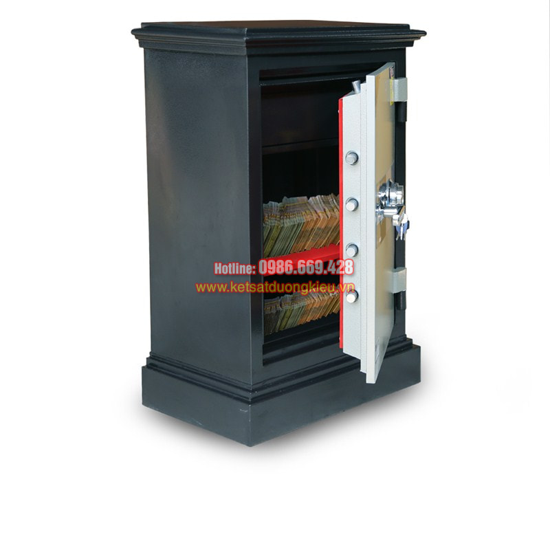 - An toàn và chống cháy, thân két đúc đặc 100%, hèm cửa dạng tam cấp giúp tăng khả năng chống cháy, chống phá, Két sắt an toàn có 8 chốt tự động ăn sâu vào trong lòng két.