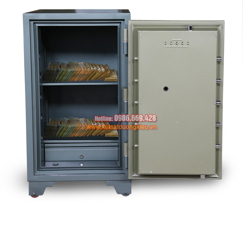 - An Toàn chống cháy Đặc Tính Kĩ Thuật: Két tiêu chuẩn ngân hàng, có kết cấu an toàn vững chắc. Lắp một khoá số, một chìa, một tay nắm ngoại Được phủ bởi 03 lớp sơn nhập ngoại kết hợp với công nghệ hiện đại đảm bảo sự bền màu theo thời gian